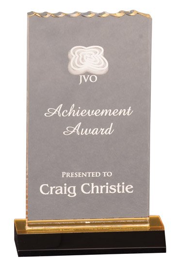 Premier Acrylic is the ultimate way to recognize the highest achievement. Reflection Gold Acrylics is ¾ inch thick and comes with gold mirror base. The base comes unattached and you will need Plastic and Acrylics Bonding Solution (PBS1) to attach. The Reflection Gold Acrylics come in 4 different styles- Beveled Peak, Ice Top, Optima and Sail. They also come in multiple sizes. They are easily customizable by either rotary engraving or laser engraving.