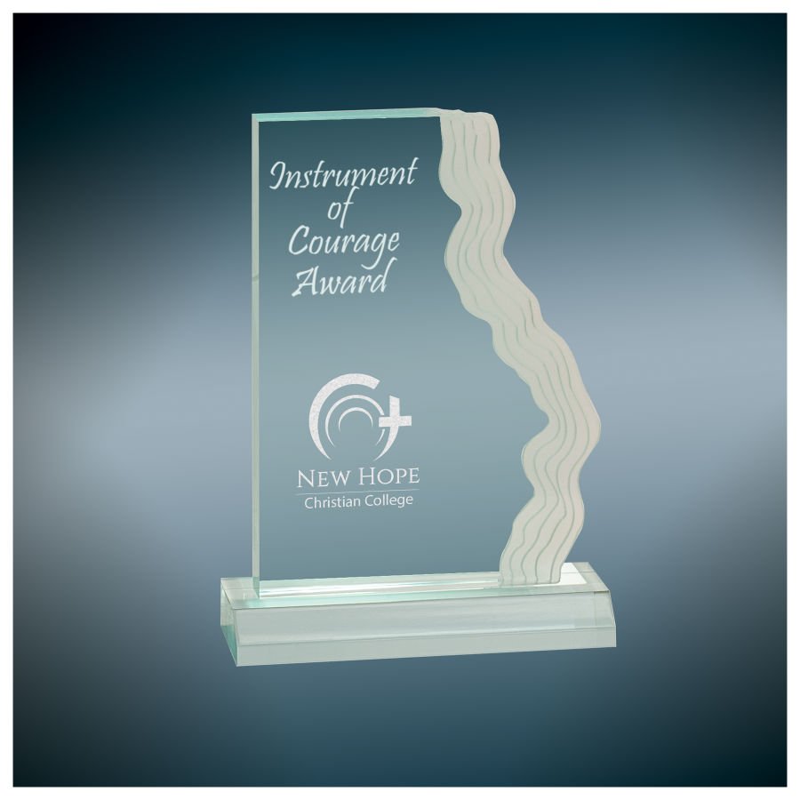 Premier Acrylic is the ultimate way to recognize the highest achievement. Frosted Acrylics is ¾ inch thick and comes with a base. The base comes unattached and you will need Plastic and Acrylics Bonding Solution (PBS1) to attach. They come in 4 different styles- Clear Waterfall, Jade Waterfall, Clear White Cap Edge, and Jade White Cap Edge. Available in multiple sizes. They are easily customizable by either rotary engraving or laser engraving.