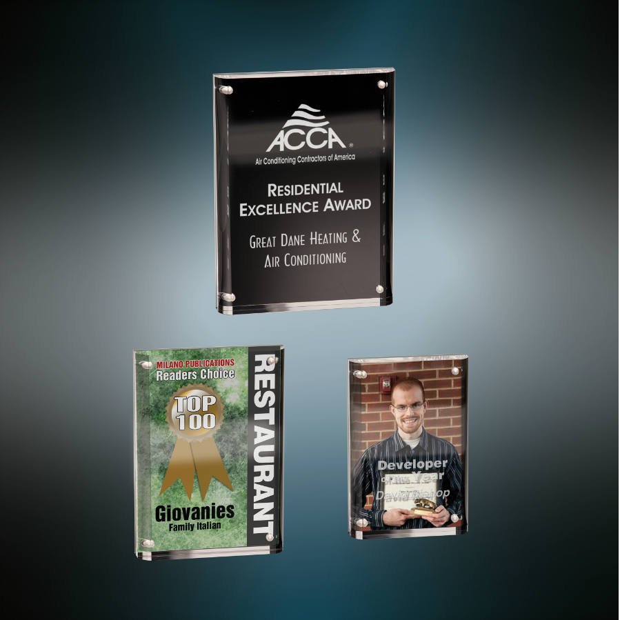 Premier Acrylic is the ultimate way to recognize the highest achievement. Magnetic Acrylics are 1 inch thick and self-standing. The front and back pieces magnetically attach creating a unique and beautiful 3-dimensional acrylic awards. This sample set comes with one of each size. They are easily customizable by either rotary engraving or laser engraving.