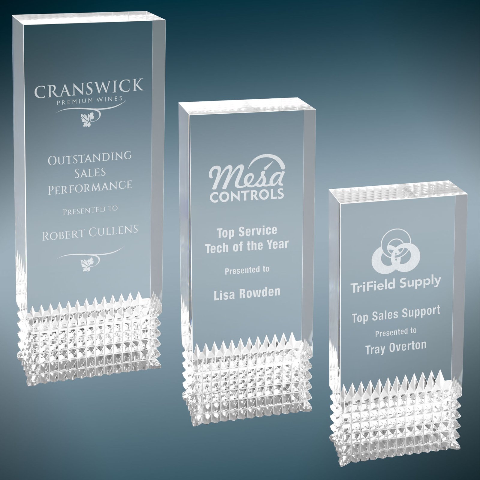 Premier Acrylic is the ultimate way to recognize and honor. Tribute Acrylics are self-standing and 1 ¼ thick. The ice like design adds a crisp, clean look. This Sample Set comes with one of each size in Silver. They are easily customizable by either rotary engraving or laser engraving.