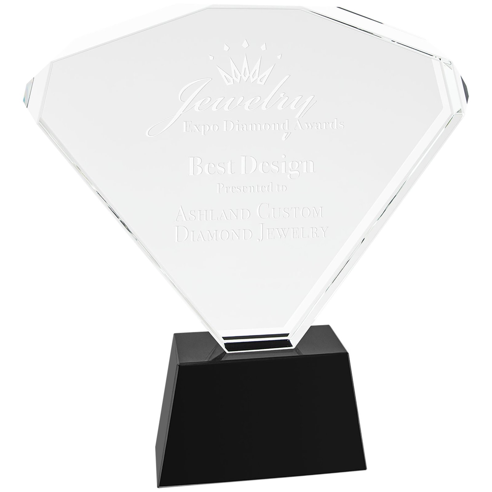 Our Premier Crystal Awards are handmade and may vary slightly in size. Crystal fan attached to black pedestal base. This award is double sided giving two unique looks. Packaged individually in a lined gift box. Premier Crystal is the ultimate way to recognize and honor!