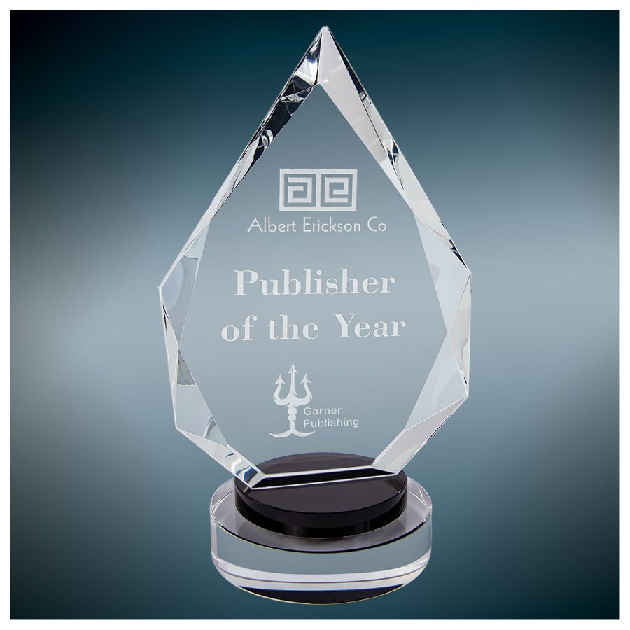 Our Premier Crystal Awards are handmade and may vary slightly in size. Optic crystal facet diamond piece on black and clear round base. Packaged individually in a lined gift box. Premier Crystal is the ultimate way to recognize and honor!