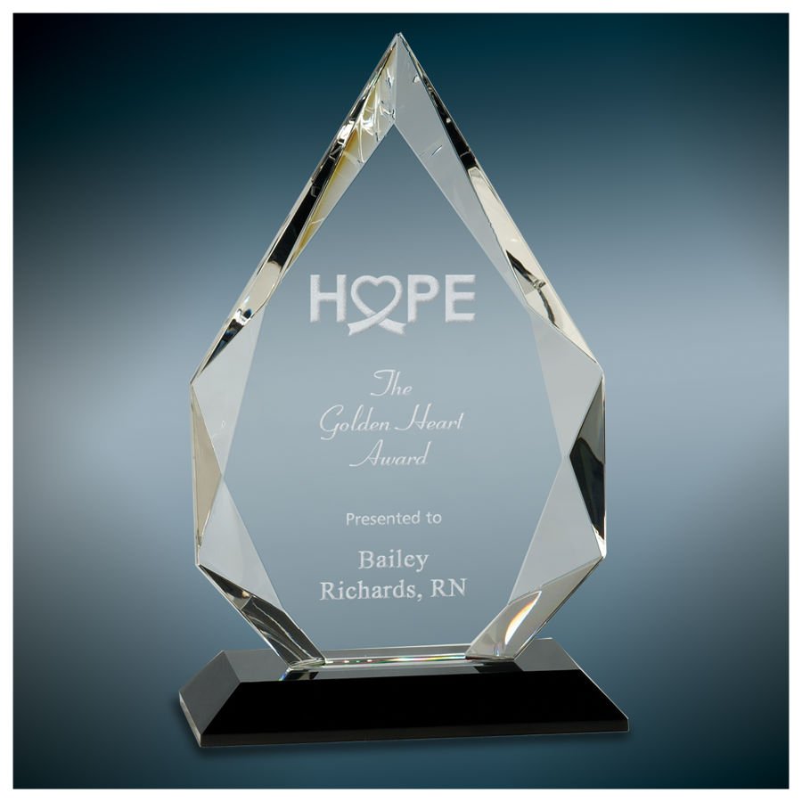 Our Premier Crystal Awards are handmade and may vary slightly in size. Diamond facet optic crystal mounted to black pedestal base. Packaged individually in a lined gift box. Premier Crystal is the ultimate way to recognize and honor!