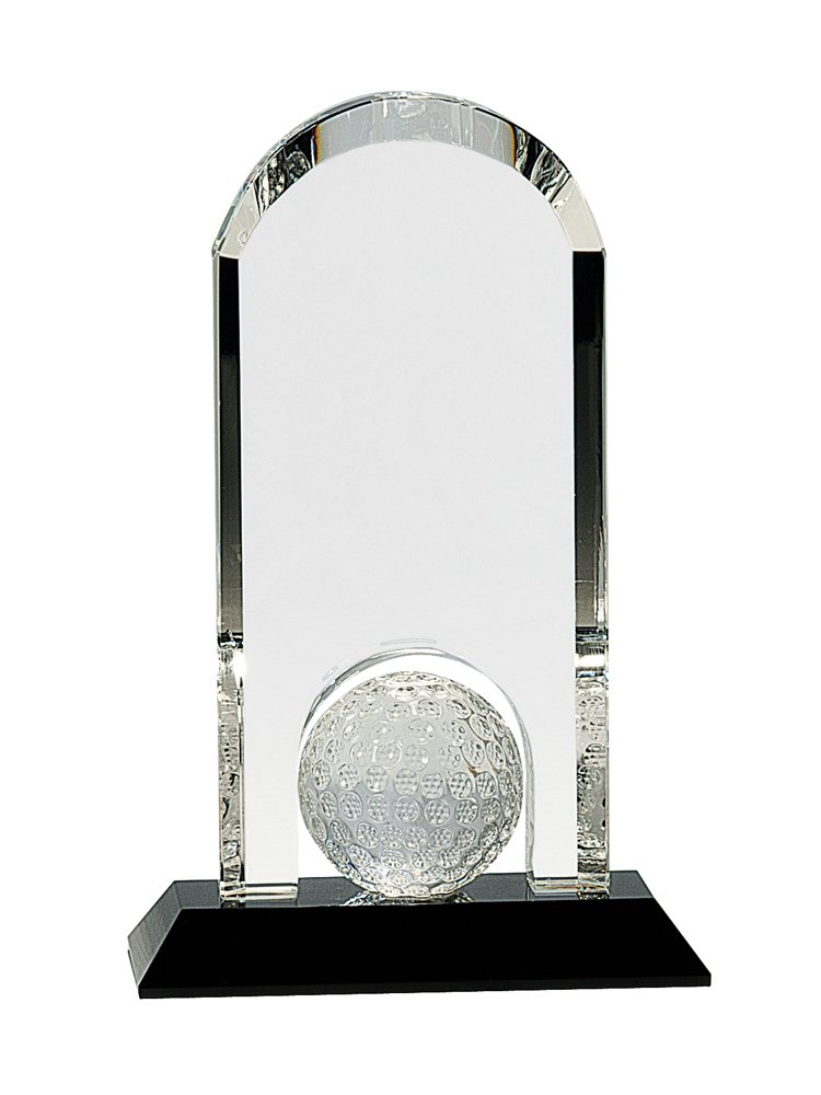 Our Premier Golf Crystal is handmade and may vary slightly in size. Clear optic crystal dome with inset golf ball attached to black pedestal base. Packaged individually in a lined gift box. Your recognition or gratitude will be crystal clear with crystal awards!