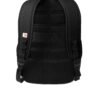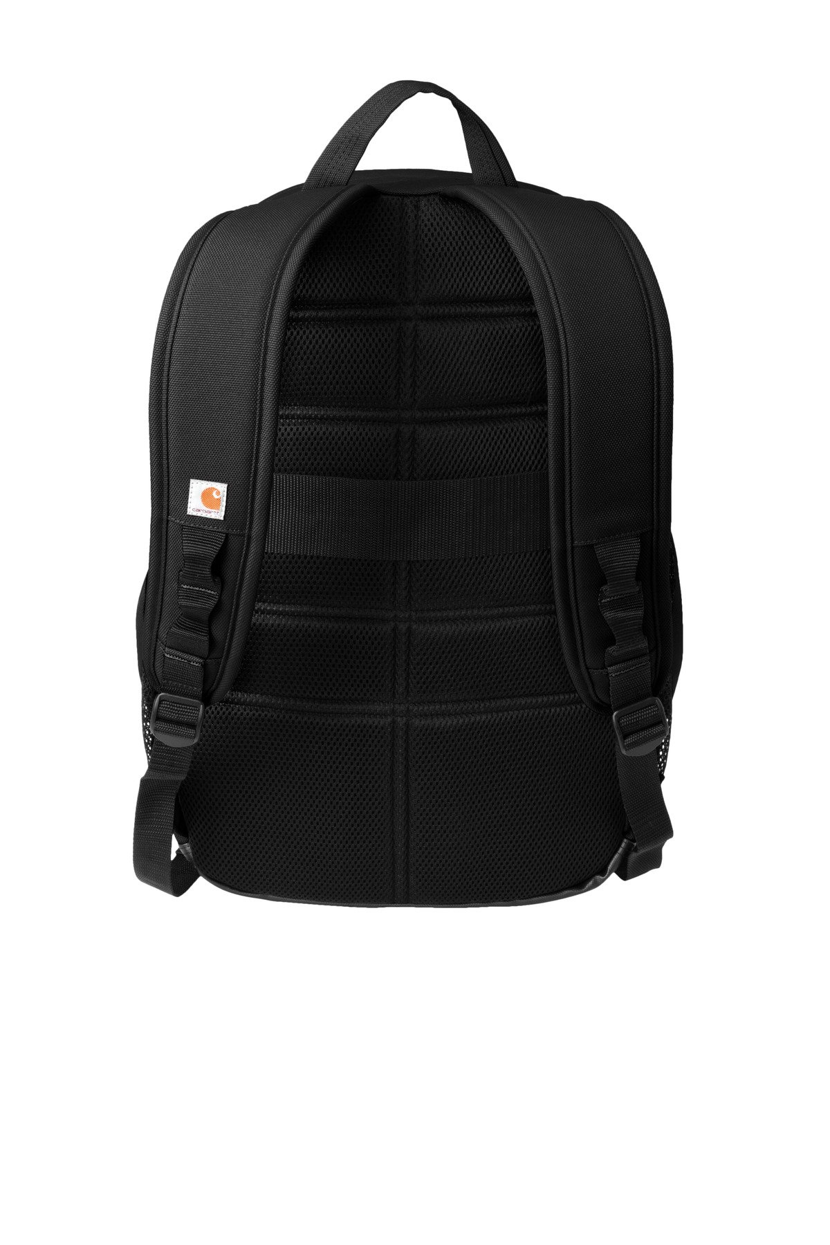 1200D heavy-duty polyester Rain Defender durable water repellent (DWR) Large main compartment with dedicated tablet sleeve Top compartment with dedicated pocket for power pack and cord port Front zippered organization 2 exterior mesh pockets Padded compartment with dedicated 15-inch laptop sleeve Contour-fit shoulder straps with FastDry sweat-wicking technology Padded air mesh back panel with a webbing strap that can fit over dual trolley handle of wheeled bag Carhartt label sewn on front top pocket Duravax abrasion-resistant base Capacity: 28L Dimensions: 18 h x 12 w x 10 l; Approx. 1 709 cubic inchesNote: Bags not intended for use by children 12 and under