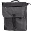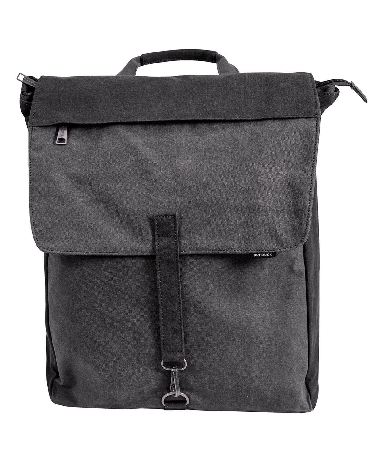 12 oz. concrete canvas, 85% cotton, 15% polyester; Padded laptop sleeve with hook and loop closure fits up to 17″ laptop; Additional tablet pocket with shared hook and loop closure; Large interior compartment with secure zipper closure; Two interior slip pockets; Zipper stash pocket on front flap; Sturdy canvas top grab handle; Metal clip and d-ring closure on flap; Adjustable padded straps; Sturdy padded bottom; 18″H x 13.5″W x 4.5″D; Capacity: 18L