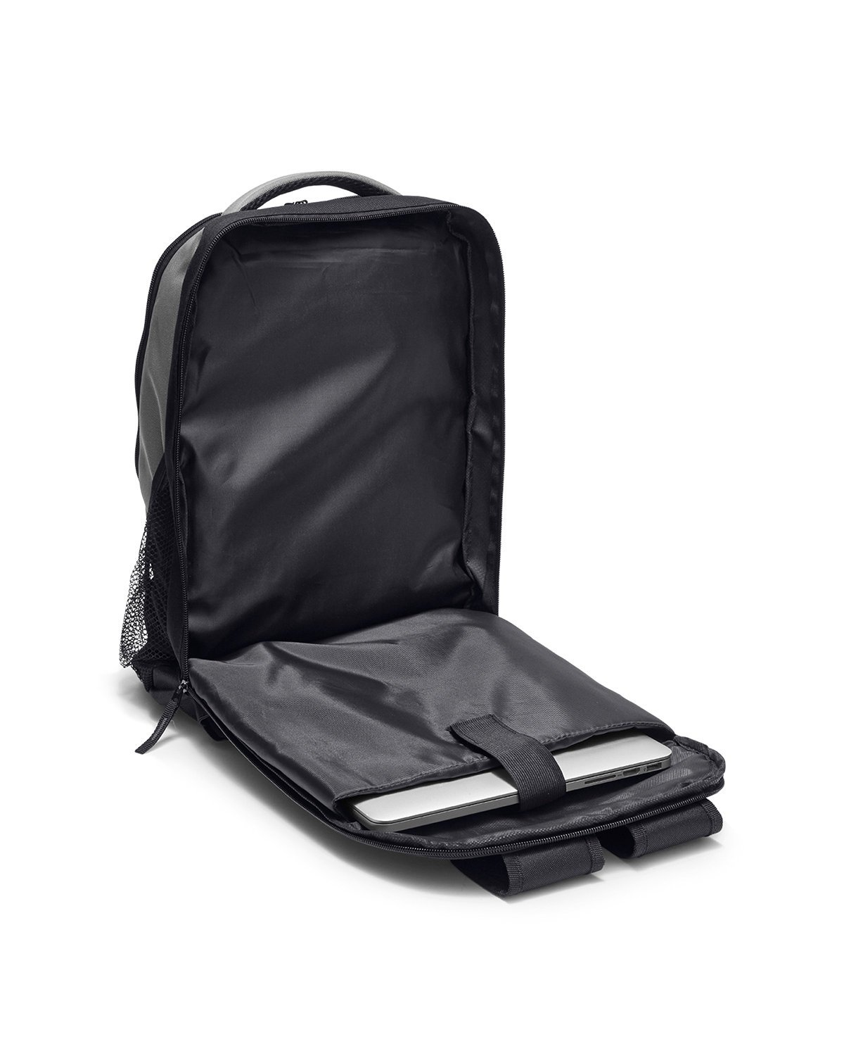 Made of 600D Polyester and 420D Polyester and features plenty of extra pockets for storage of cables, notebooks and other items; Laptop backpack with convenient back access compartment; Padded laptop sleeve holds most laptops up to 15.6″; Padded and adjustable shoulder straps; Two side mesh pockets and front zipper pocket: 9.25″w x 11″h; Rubber earbud port on front top panel; To clean wipe with damp cloth; Recommended weight tolerance: 33 lbs; Product Size: 10.5″ w x 18″ h x 5″ d