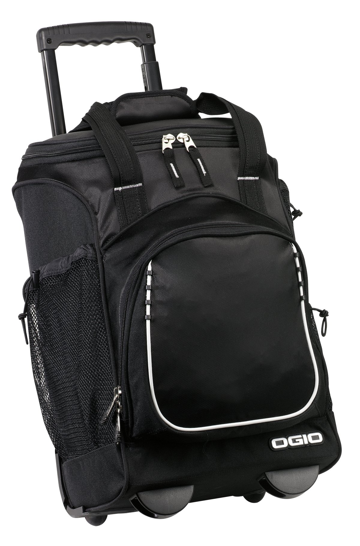 Party-sized cooler rolls with ease on sturdy wheels with an adjustable-height handle. Due to the size and/or weight of this product it may require additional freight charges. See our Ordering Terms and Conditions for details.600D poly/420D dobby poly Two-stage Pullman handle Three large exterior mesh pockets Exterior front pocket with mesh organization inside Smooth roller wheels 36-can capacity PEVA cooler liner Dimensions: 20 h x 12 w x 9 d Capacity: 2 000 cu.in./32.8L Weight: 5 lbs./2.3kgNote: Bags not intended for use by children 12 and under. Includes a California Prop 65 and social responsibility hangtag.