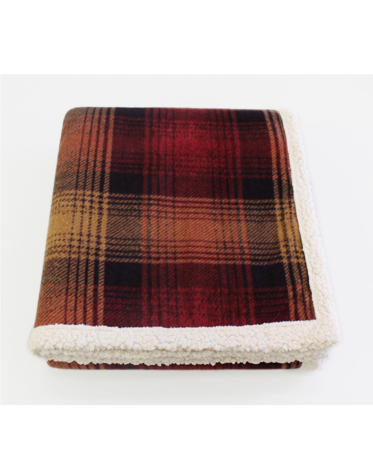 100% polyester; super-soft plaid polar fleece reversible faux lambswool throw; includes vinyl zippered bag; 50″ x 60″