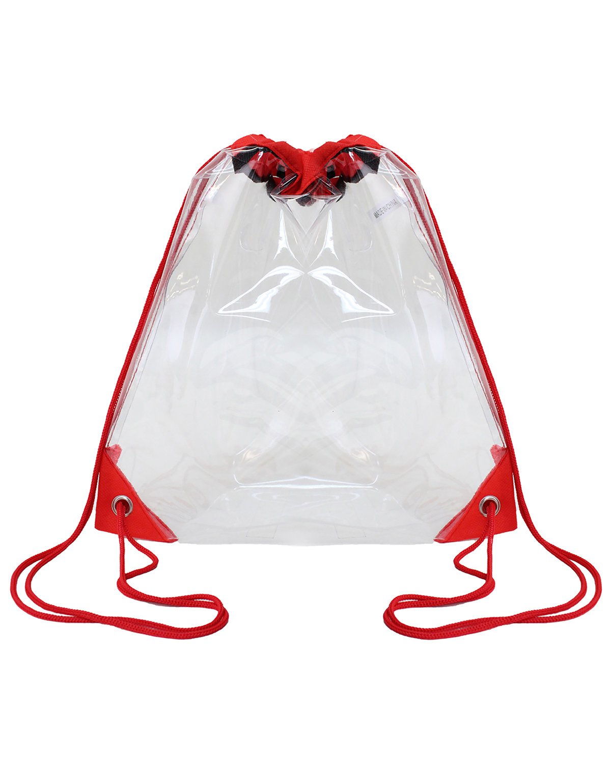 Made of clear PVC material; On-woven trim; Color matched drawstrings; Reinforced corner grommets; Stadium compliant; 12″ x 12″