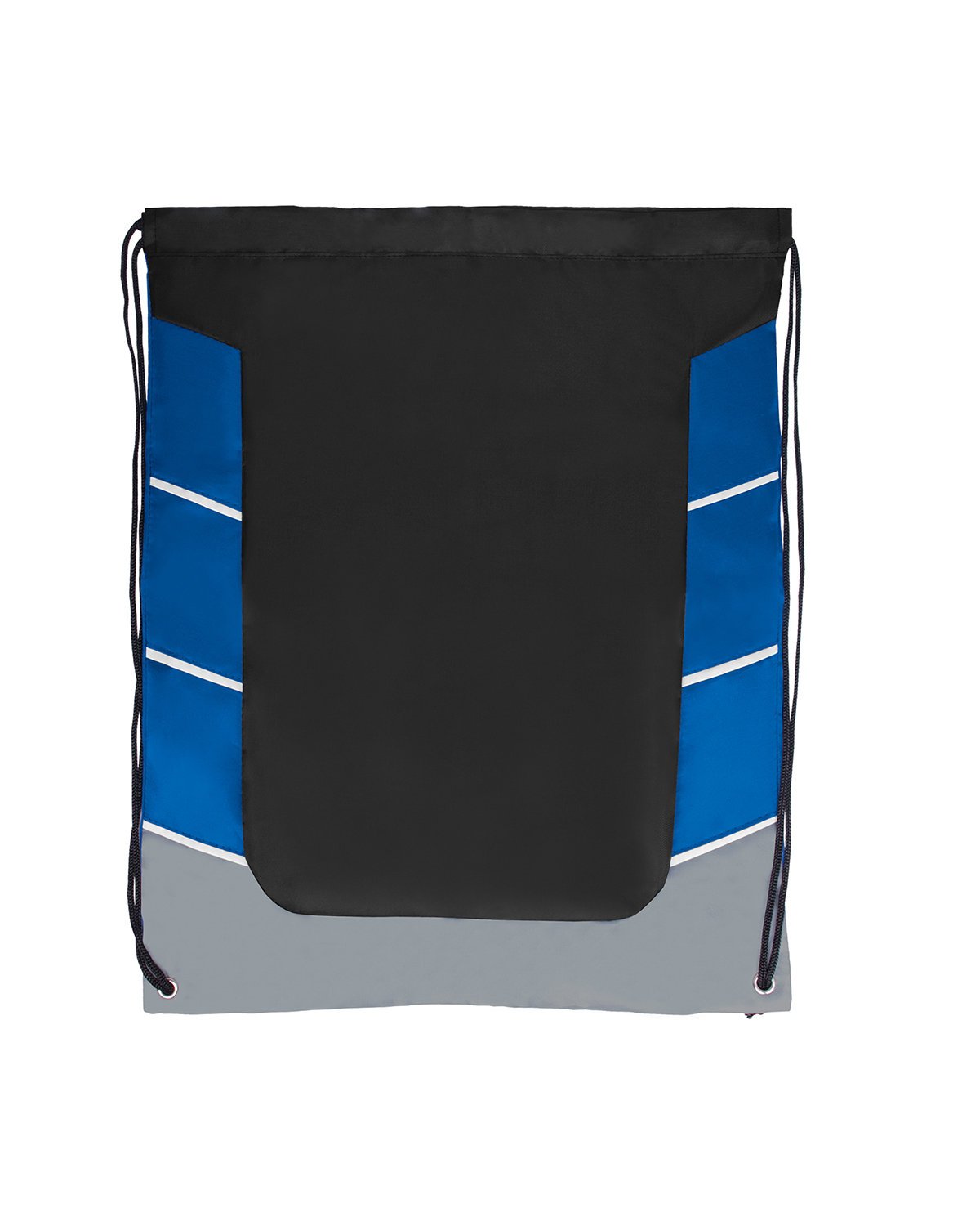 210D Polyester ; Drawstring backpack with side color accent panels with bottom gray panel and gray piping; Adjustable soft Nylon shoulder strap doubles as drawstring closure; Reinforced black grommeted corners; Recommended weight tolerance: 6.5 lbs; Product Size: 14.125″ w x 14.5″ h