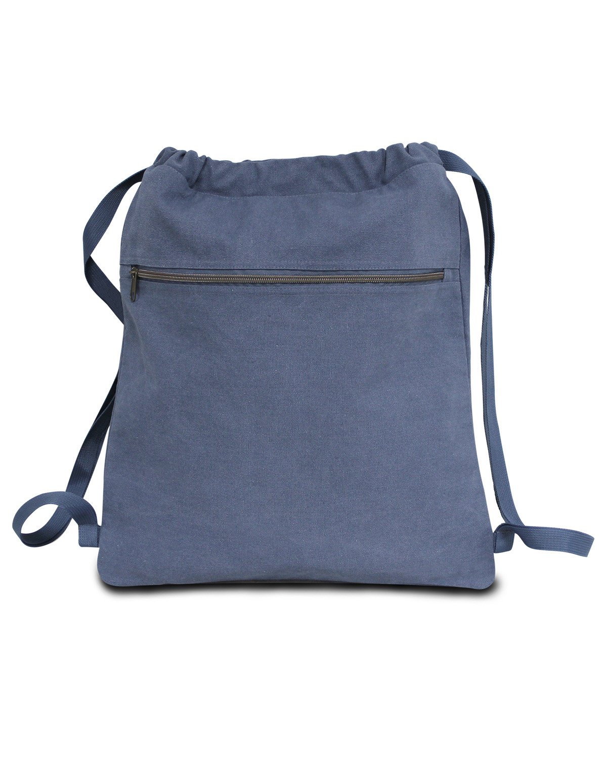 Premium 12 oz pigment dyed cotton canvas drawstring bag; 14.5″ x 17.5″ ; Zippered front pocket opening: 13.5″ W ; Matching web drawstring ; Non-branded label/tag