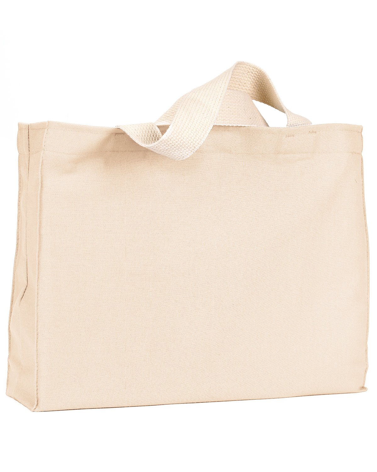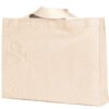 12 oz., 100% cotton canvas; Full side and bottom gusset; Natural web handles reinforced at stress points; 13″w x 9″h imprint area; Size: 14 1/2″w x 11″h x 4″d; Made in the USA