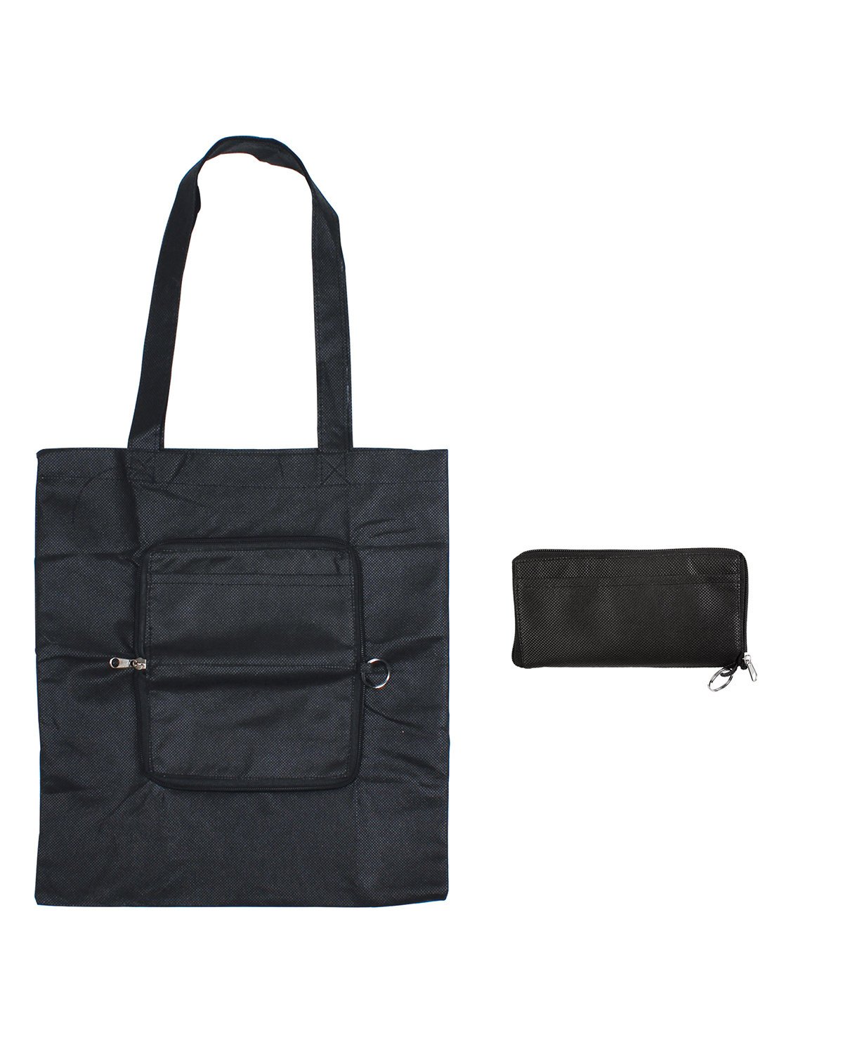 Made of durable and eco friendly 80 GSM Non-woven Polypropylene; This Eco-responsible tote bag is an alternative to single-use plastics, is reusable and recyclable, and is made from 10% Post-Consumer recycled content; This Eco-responsible tote is a reusable and recyclable alternative to single-use disposable plastics, and it is also made from 2% Post-Consumer recycled content; Includes metal split ring fastened to zipper to attach plastic key tag store discount, loyalty and membership cards; Features front open pocket and 22″ long reinforced handles; Easily folds into pouch (all one piece) measuring 7″w x 4″h; Bag ships folded; Recommended weight tolerance: 33 lbs; California Prop 65 Warning; Product Size: 13.375″ w x 14.5″ h