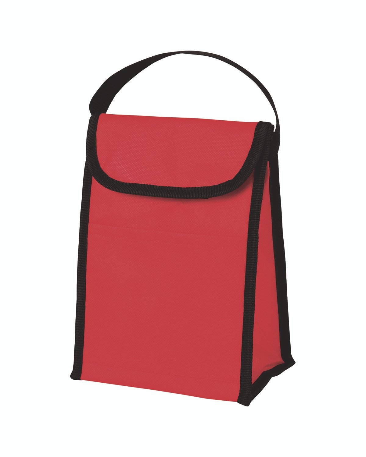 Lunch bag made of durable 80 GSM Non-Woven Polypropylene exterior with thermal food-safe foil main compartment; The Non-Woven material in this bag is made from 10% Post-Consumer recycled content; This Eco-friendly lunch bag is also reusable and recyclable; Features hook and loop fastener; 5″ front open pocket ; 16″l x 1″w reinforced webbing handle; Holds up to 6 12-ounce cans; Recommended weight tolerance: 5 lbs; Product Size: 7.25″ w x 10″ h x 4.75″ d