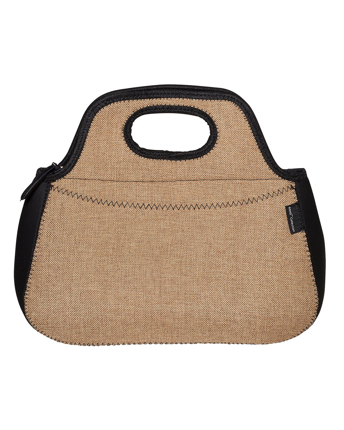Neoprene; Lunch tote accented with burlap fabric ; Unique design is strong and durable featuring a zipped closure ; Holds as many as 7 cans of soda; Recommended weight tolerance: 11 lbs; Product Size: 12″ w x 10.25″ h x 6″ d