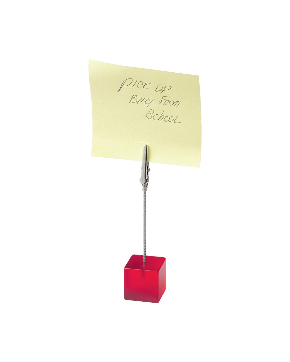 Acrylic ; Square-shaped photo, memo or document holder; Features weighted cube base; Sturdy metal wire cable with alligator clip; Product Size: 0.875″ w x 4.25″ h x 0.875″ d