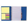 Cover is made of 70% recycled materials and magnet closure is made of 95% pre-consumer recycled materials; Right side features 70 lined sheets of 100% pre-consumer recycled paper; Eco-friendly chipboard wire-bound notebook with magnetic flap closure; Includes multiple paper sources: Right side features 70 lined sheets of 100% pre-consumer recycled paper, left side features 5 assorted sticky flags, one 2×3 sticky pad, and one 4×4 sticky pad – each with approx.25 sheets Not refillable; Includes elastic pen loop with matching recycled black ink pen (with plastic clip and trim) inserted; Product Size: 5.75″ w x 7.25″ h x 0.5625″ d