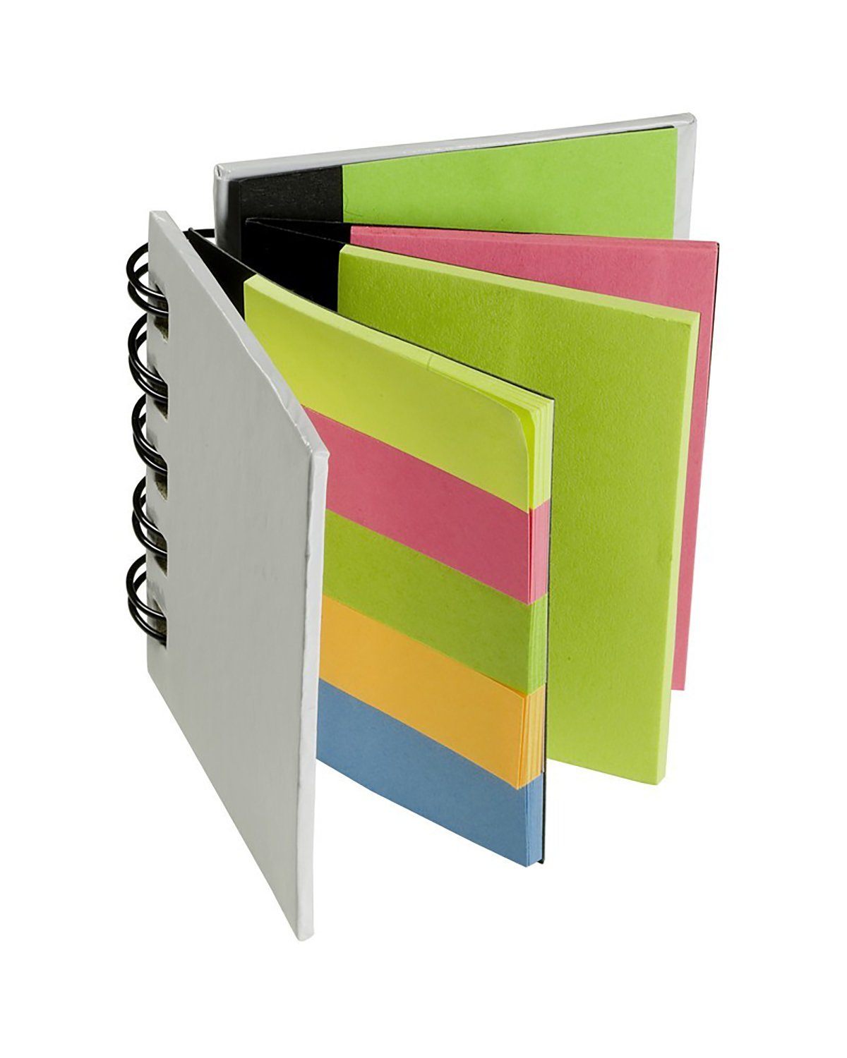 Includes five assorted sticky page flags of 25 sheets and three assorted 3″ x 2″ sticky pads each mounted on cardboard backing; Cardboard cover with double metal ring binding; Product Size: 3.25″ w x 3″ h x 1″ d