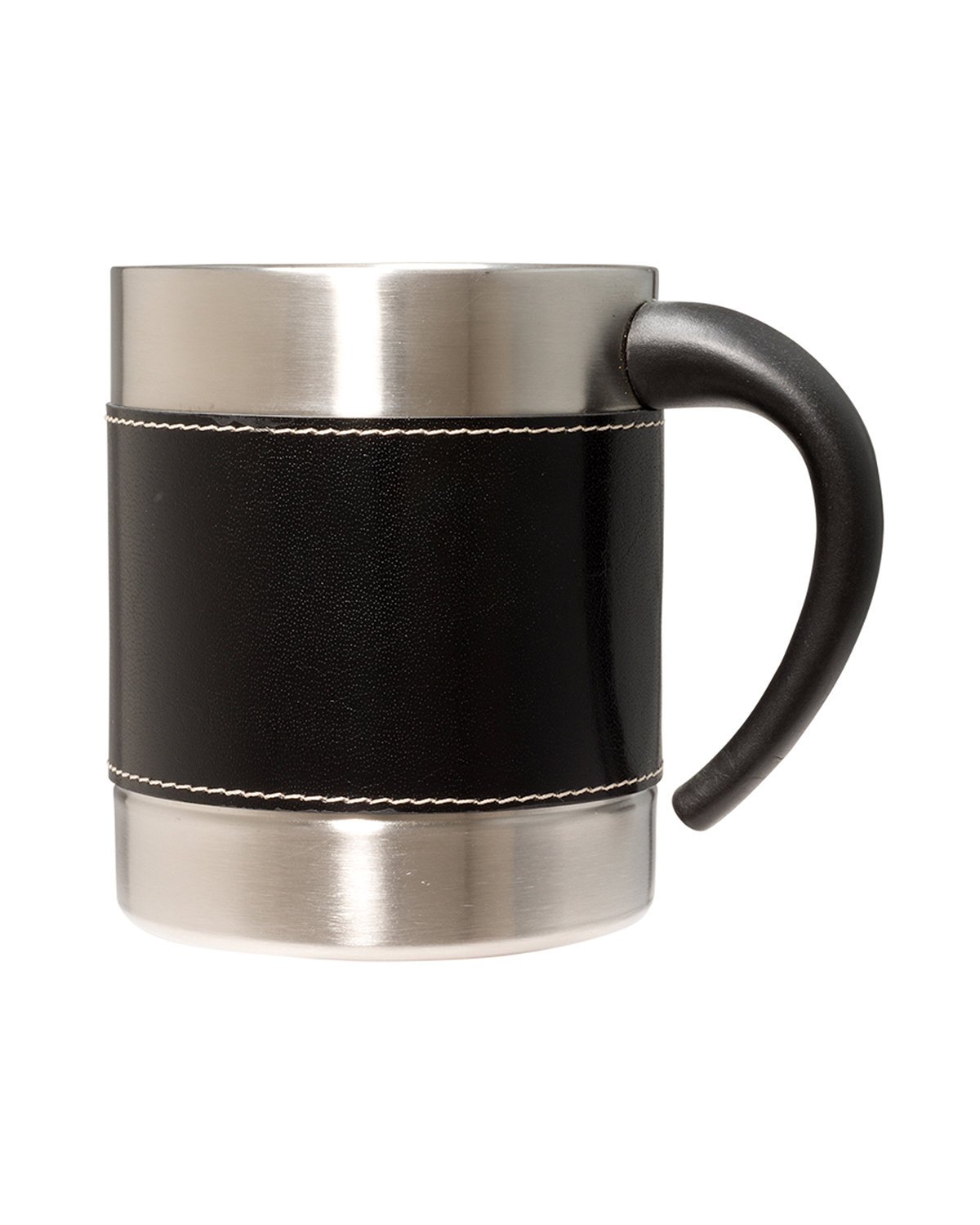 10 oz. (295 mL) double-wall insulated Stainless Steel mug with Aristo Bonded Leather sleeve with top and bottom stitched accents; Heat-resistant Polypropylene plastic handle; The Bonded Leather sleeve is made of 85% to 90% Post-consumer recycled materials, making this an eco responsible product; Remove sleeve prior to washing (hand-wash only); Product Size: 3.75″ h x 3″ dia.
