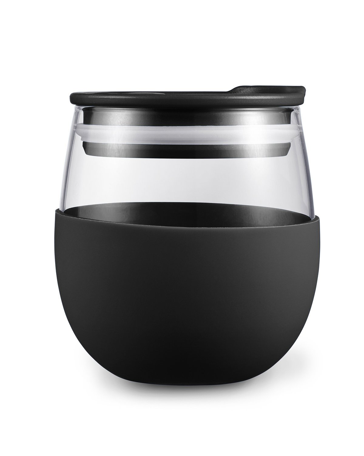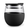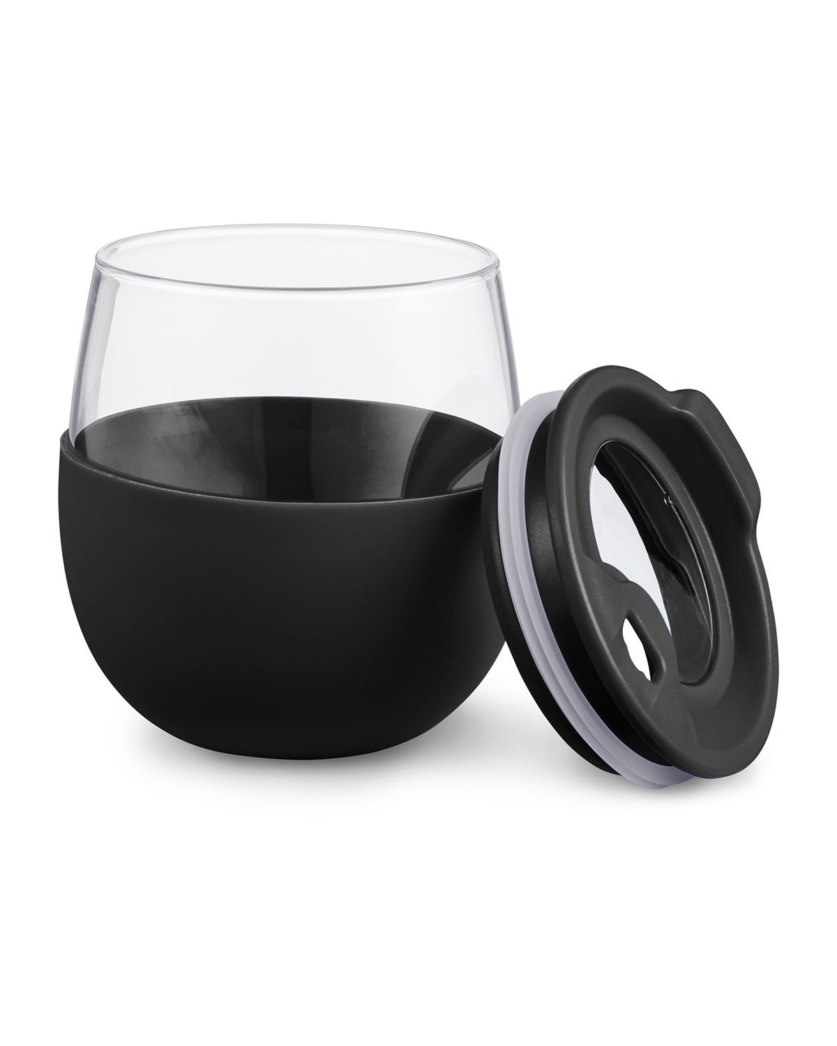 18.59oz (550 mL) sphere single-wall Glass tumbler with color Silicone grip; Duo Polypropylene plastic and Tritan plastic lid; Press lid to drink; Hand-wash only; Designed for use with both hot and cold liquids; Product Size: 4.25″ h x 4″ dia.