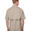 3.8 oz., 100% cotton poplin; Performance fishing gear; Self-adhesive collar points; Vented; Utility loop; Columbia PFG logo patch on rod holder on left chest; PFG logo patch on center back
