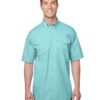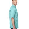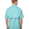 3.8 oz., 100% cotton poplin; Performance fishing gear; Self-adhesive collar points; Vented; Utility loop; Columbia PFG logo patch on rod holder on left chest; PFG logo patch on center back