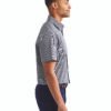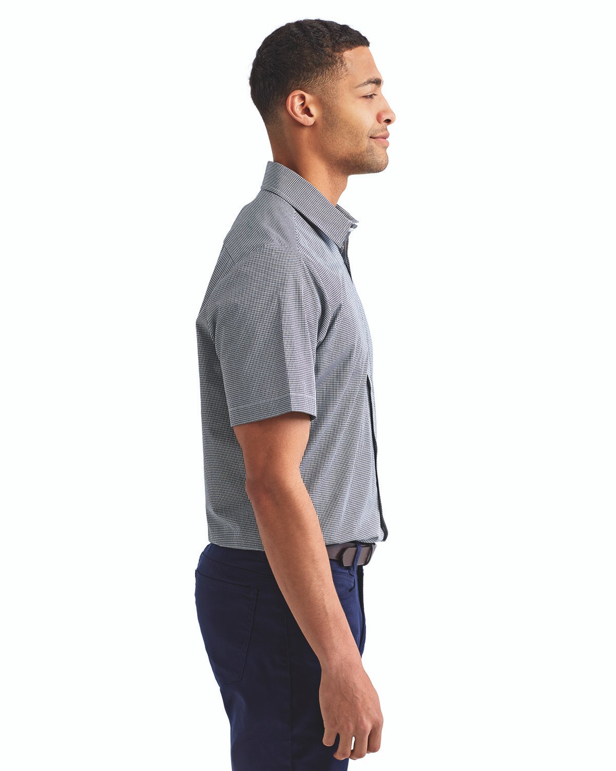 3.4 oz., 100% cotton yarn dyed poplin; popular ginghan microcheck; semi-fitted styling; soft-collar styling; short-sleeve; Oeko-Tex® Standard 100 certified; WRAP certified