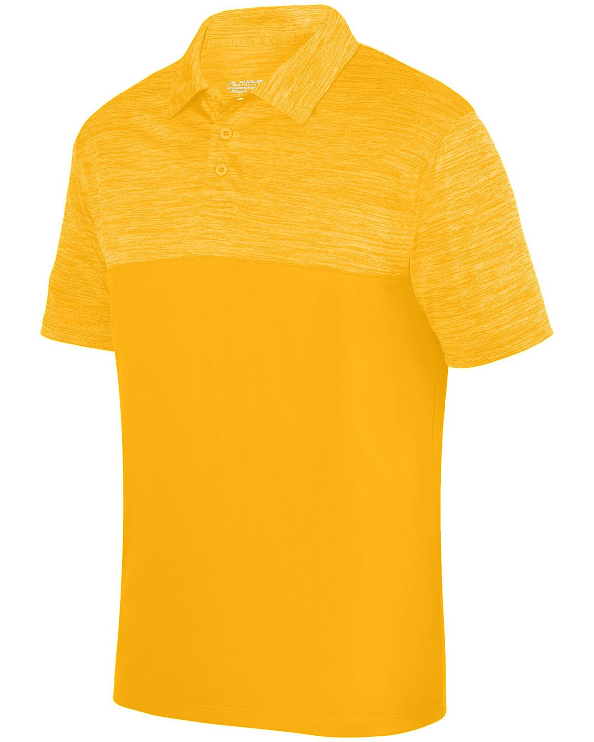 4.3 oz., 100% polyester heathered wicking knit top body, collar and sleeves; 3.3 oz., 100% polyester wicking knit solid body; Wicks moisture away from the body ; Tagless label; Contrast self-fabric collar, placket, and yoke; Contrast set-in sleeves ; Box-stitched placket ; Three matching buttons with cross-stitching