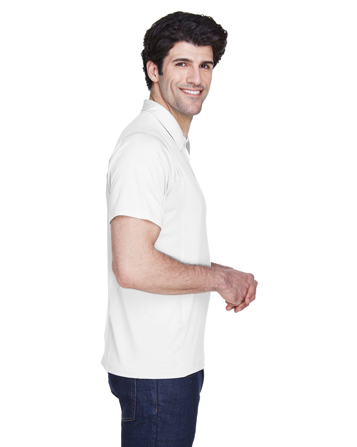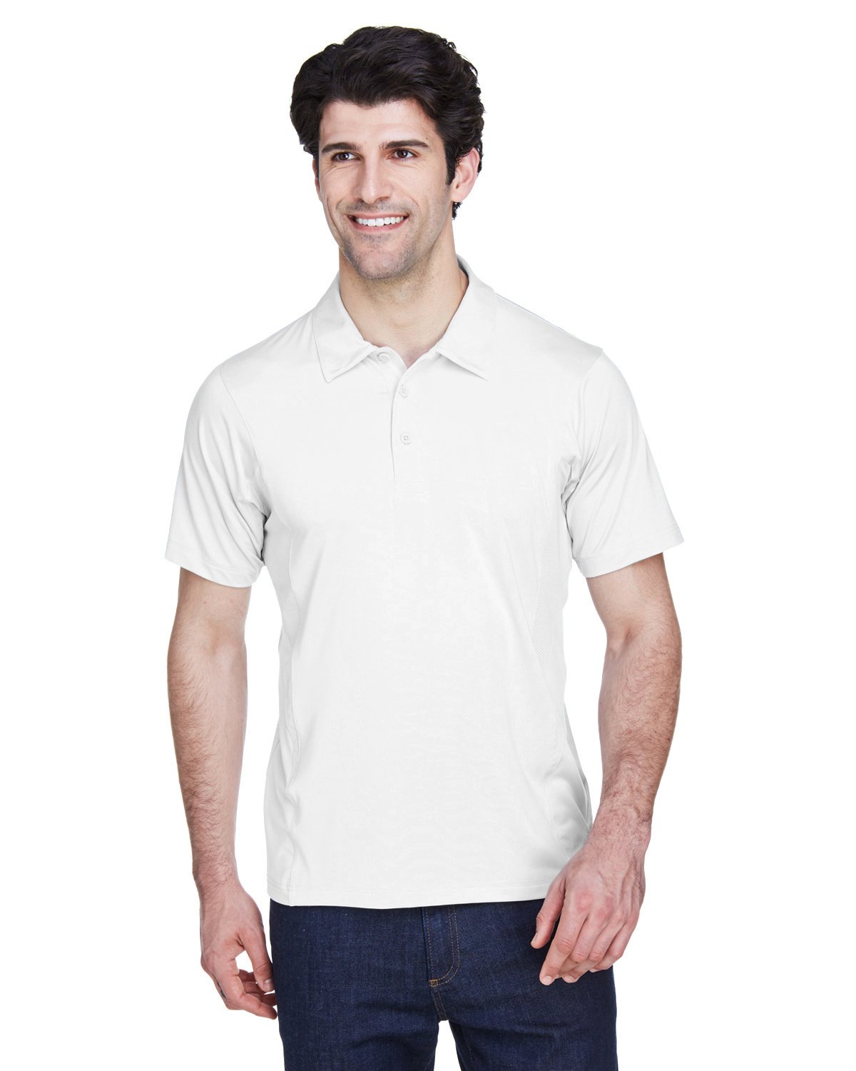 5 oz., 91% polyester, 9% spandex body; 4.7 oz., 91% polyester, 9% spandex pointelle mesh side panels ; moisture-wicking and anti-microbial; cationic dyes to ensure superior brightness and excellent color fastness; athletic fit; self-fabric collar; Sport Silver inner neck tape; sewn-in shoulder tape; three-button placket with dyed-to-match buttons