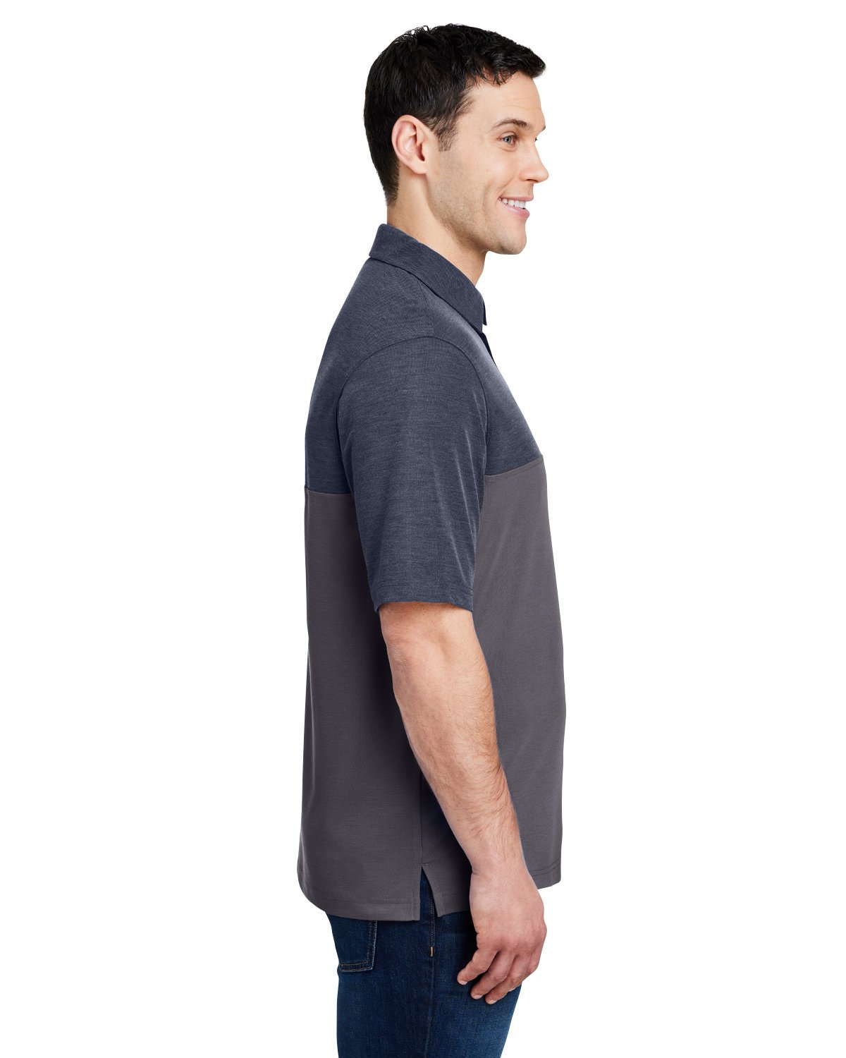 Body: 6 oz./yd2 / 210 gsm, 100% polyester pique; Contrast: 6 oz./yd2 / 215 gsm, 100% polyester heather pique in upper body; Moisture-wicking, antimicrobial; Self-fabric collar and integrated collar stays; Three-button placket; Tear away label; ChromaSoft technology combines the colorfastness of cationic dyes with soft cotton-feel performance