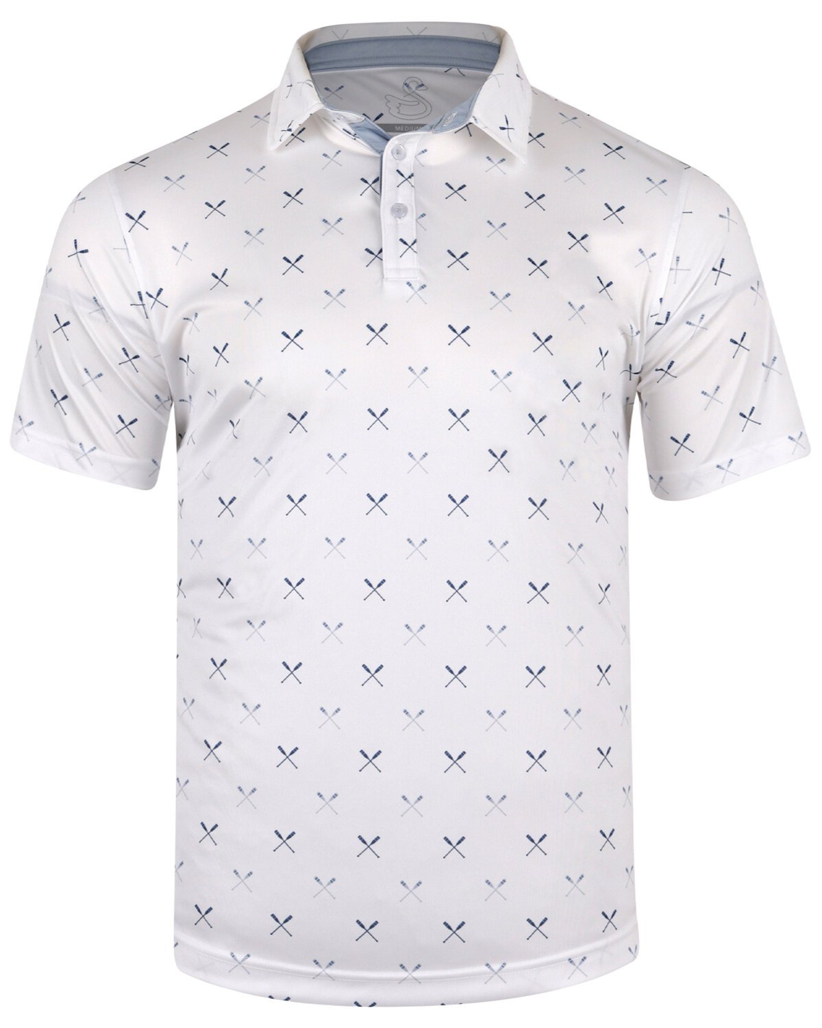 100% Polyester REPREVE; Three-button placket; Collar stay; Full stretch; Curved hemline