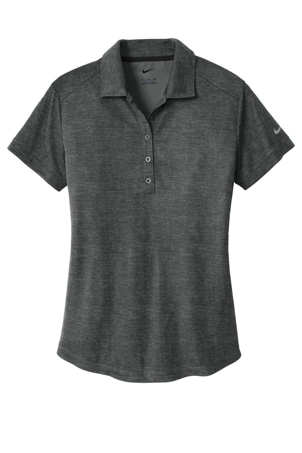 The allover crosshatch print adds a technical look to this polo while the Dri-FIT fabrication delivers performance and ensures breathable comfort. Tailored for a feminine fit. Design details include a self-fabric collar five-button placket and open hem sleeves. A contrast heat transfer Swoosh design trademark is on the left sleeve. Made of 5.29-ounce 100% polyester Dri-FIT fabric.