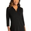 The updated look of this polo-inspired tunic has a longer length to keep you covered while still looking polished. The stretch in the machine-washable fabric ensures you feel comfortable. 6.6-ounce 94/6 rayon/spandex jerseySelf-collar with collar standButtonless front placketNotch detail on sleeve cuffsSide ventsSlightly curved hem with drop tail