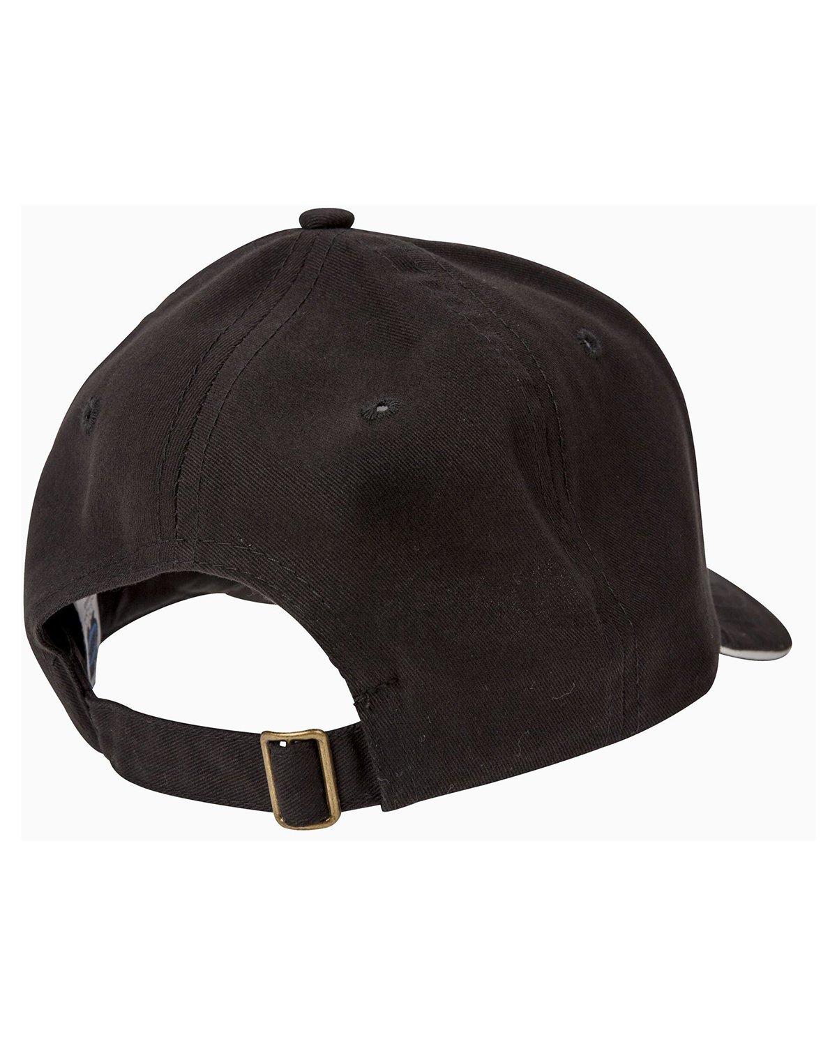 100% washed cotton twill; 6-panel, structured, low-profile; front panel constructed with buckram; precurved, two-tone sandwich bill; sewn eyelets; self-fabric closure with D-ring slider and tuck-in strap
