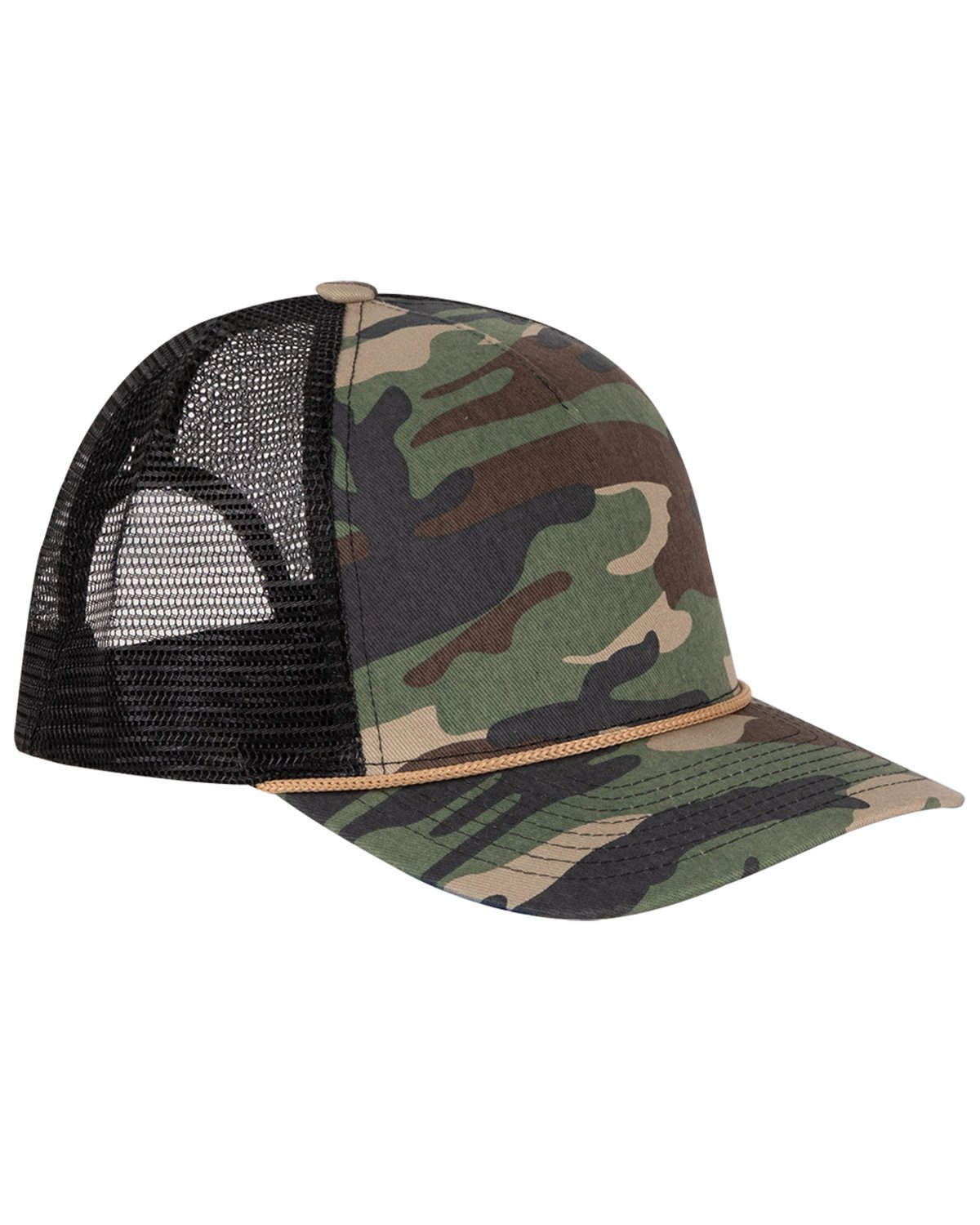 100% cotton twill ; 100% polyester mesh back ; 5-panel, structured; Pro shape crown; Semi-curved visor ; NO Sweat moisture-wicking sweatband; Snapback closure