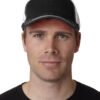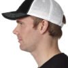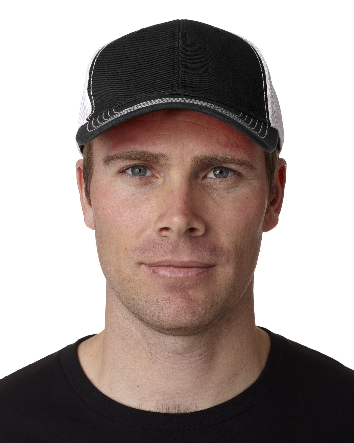 100% washed cotton twill front panels and visor; 100% polyester soft mesh back panels; Structured; Mid-profile; 6-panel; Self-adhesive closure; Matching top button and sewn eyelets; Contrast stitching on visor and self-fabric sweatband