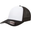 55% polyester / 43% cotton / 2% spandex; 3 1/2″ Crown height; White front panels ; 8 rows of stitching on visor; Elastic Flexfit Trucker Mesh ; Hard buckram Silver undervisor