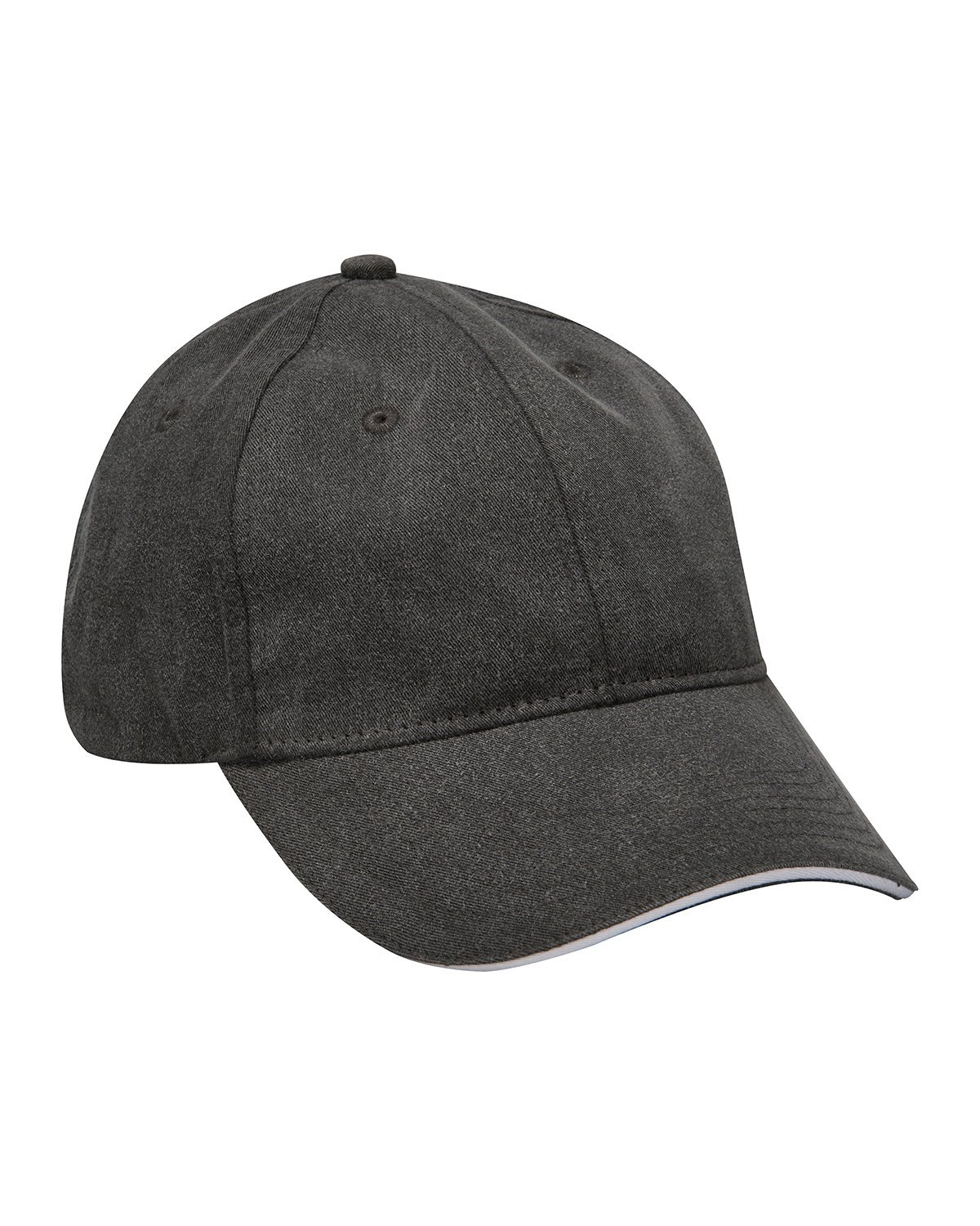 100% cotton twill; Pigment-dyed, garment-washed; 6-panel, semi-structured, mid-crown; Tuck-away self-fabric back strap with antique brass buckle and grommet; Contrast color sandwich precurved visor; Adams logo printed seam tape
