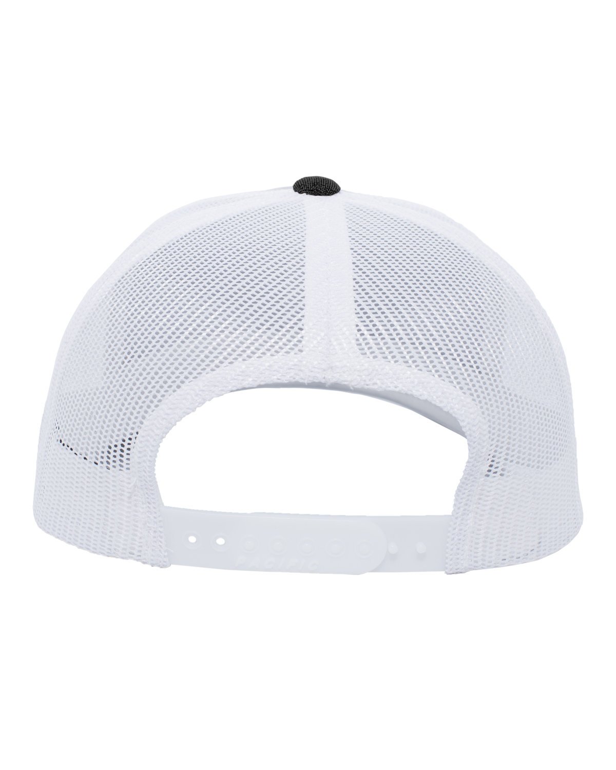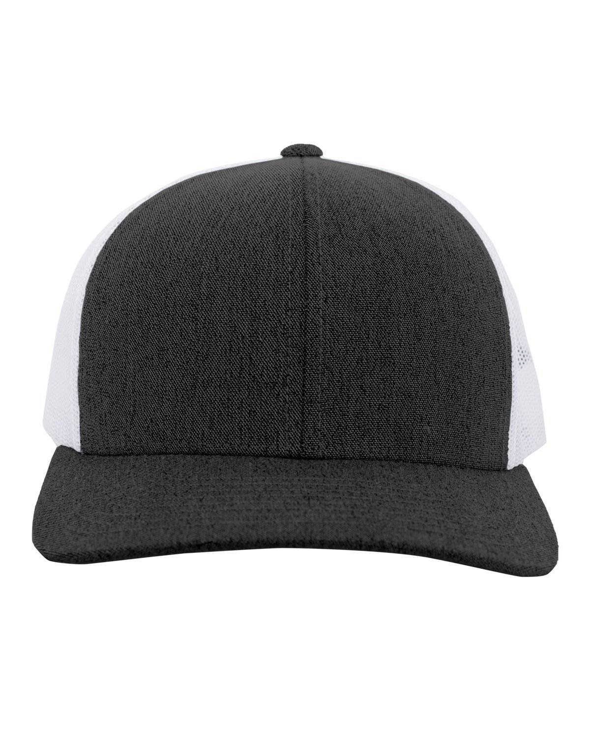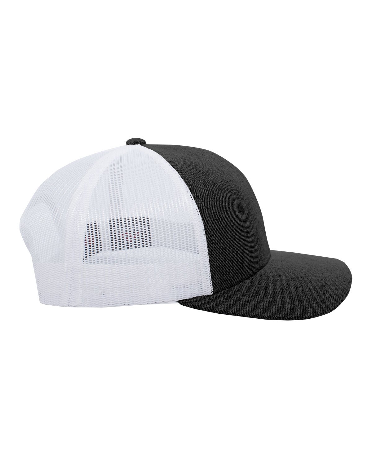 Polyester-rayon blend Melange heather, trucker mesh; 6-panel, structured, mid-profile; Eight-row stitching on curved visor; Hard buckram backed front panels; Black or grey undervisor; Plastic adjustable closure