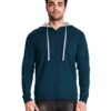 5.3 oz., 30 singles; 60% combed ringspun cotton, 40% polyester French Terry fleece; Matching zipper and eyelets; Contrast 3/8″ Binding All Around Neck; 1×1 ribbed cuffs and waistband; Side seam; Tear away label; Regular fit; Features contrasting and matching jersey-lined hood with flat drawcords; Part of the Beach Fleece collection, keep it casual cool with laid-back apparel; Next Level Apparel has a recycling program for all fabric waste collected from the cutting process. All fabric scraps are sent to a recycling company that cleans and processes them to be used for cushion filling, rugs, etc. To date, 24.3M pounds of fabric have been recycled.