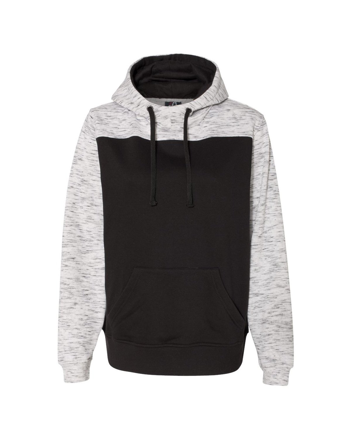 7.25 oz. 60% cotton, 40% polyester melange fleece; Scuba neckline; Contrast fabric on hood, shoulders, and arms; Front pouch pocket; Rib waist & cuffs