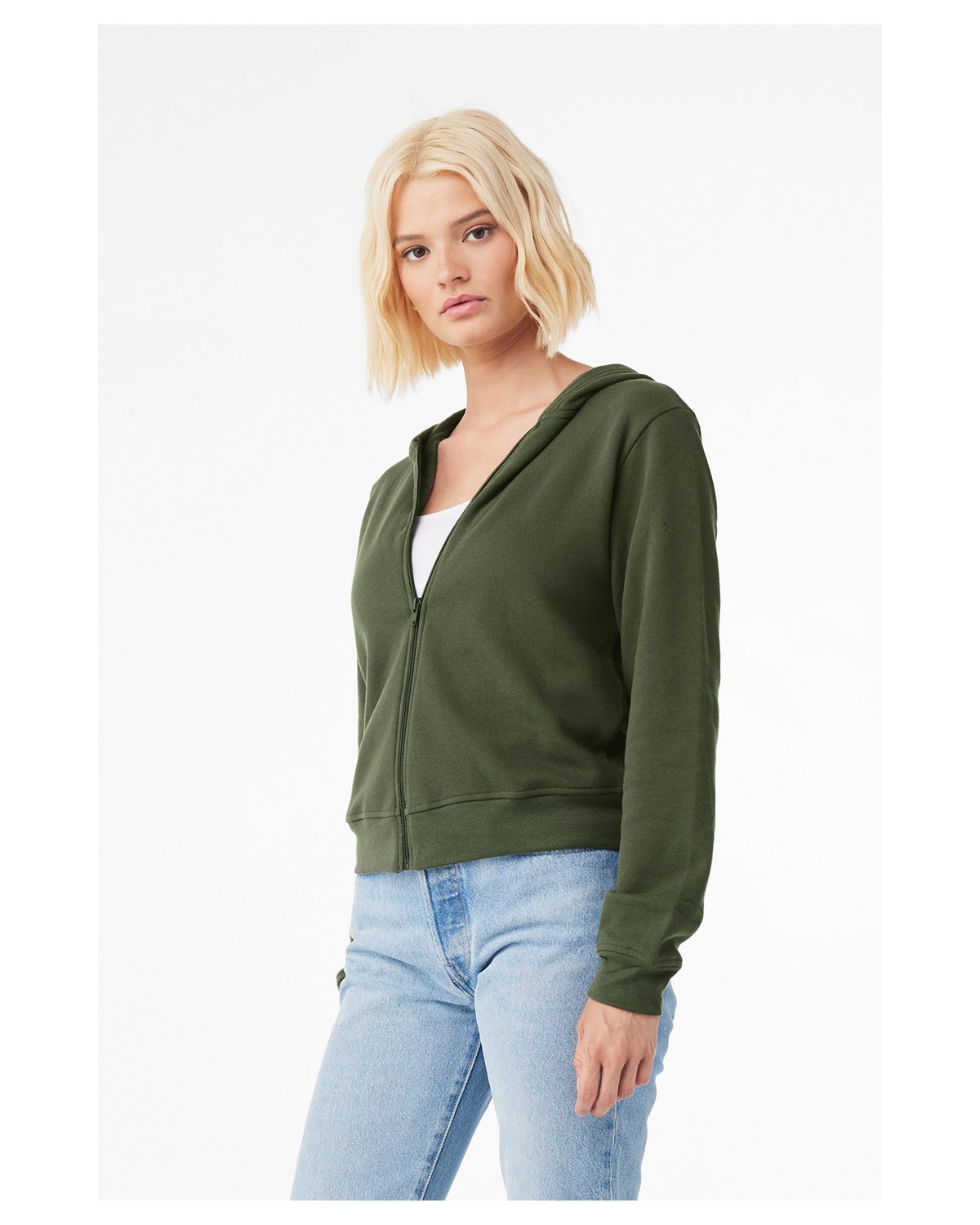 8 oz., 32 singles; 52% Airlume combed and ring-spun cotton, 48% polyester fleece; Athletic Heather: 90% Airlume combed and ring-spun cotton, 10% poly fleece; DTM zipper; Single-liner hood; Semi-set in sleeves; No pockets; Mid-length; True to size, classic fit; Tear away label