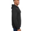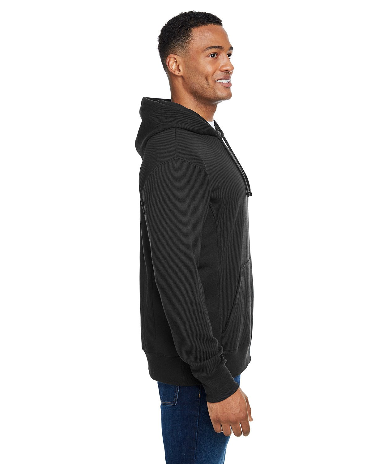 8.25 oz., 55/44 cotton/polyester knit ottoman fleece; Horizontal stripe texture throughout fabric; Jersey-lined hood with sewn eyelets and matching drawcords; Twill tape back of neck tape, set-on pouch pocket; Air-spun fleece side gussets with no sideseam; 2×2 rib cuffs and waistband; Double-needle stitched throughout; Tear away label