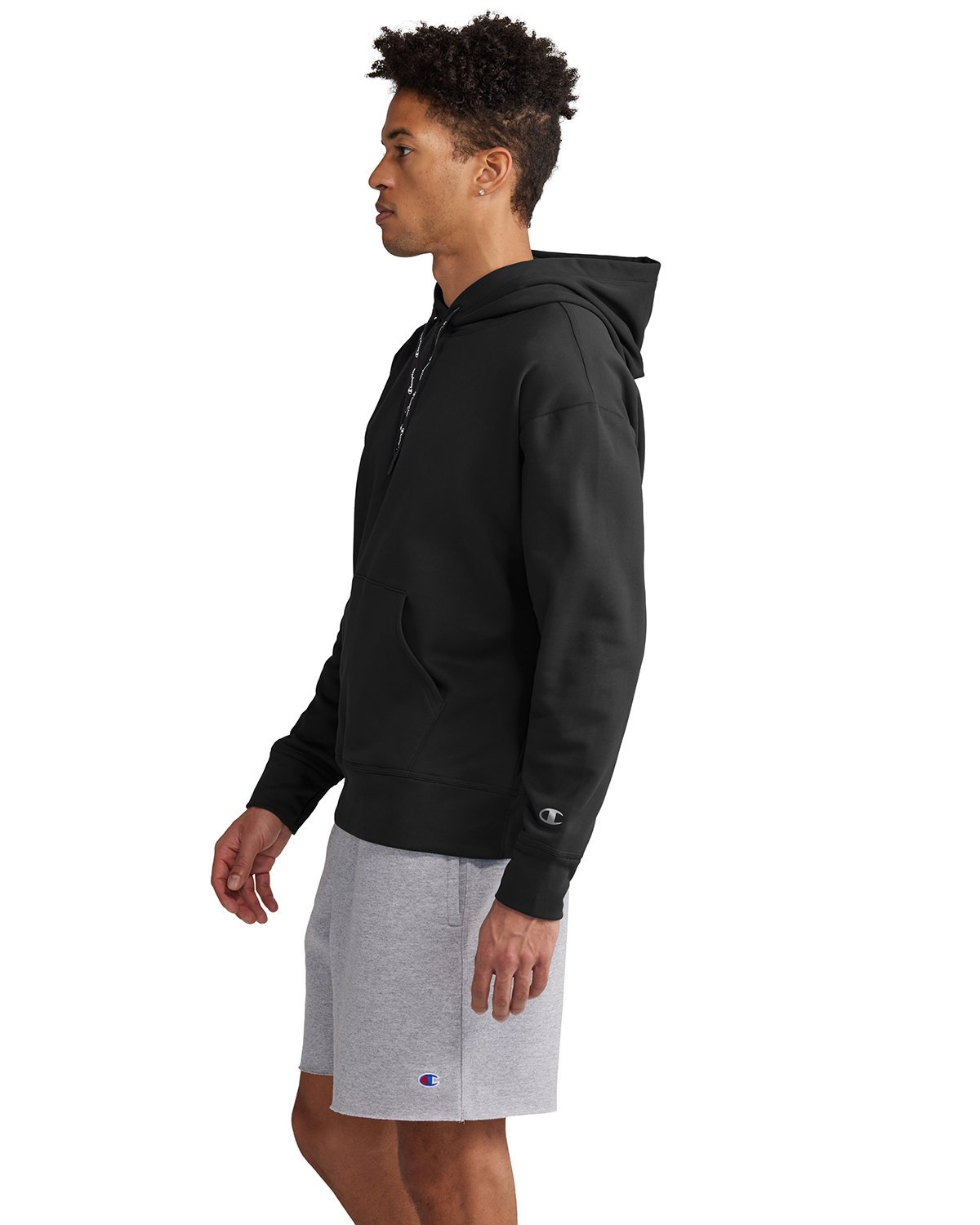 5.5 oz., 95% recycled polyester, 5% spandex; Single-ply hood; Champion logo black drawcord; Pouch pocket; Self-fabric cuffs and waistband; Champion “C” patch on left sleeve; Triple needle stitch details at cuffs, waistband and hood; Heat sealed neck label; “A-” list status from CDP (Carbon Disclosure Project) ; Energy Star Partner of the Year (14 consecutive years); Every piece of Champion apparel purchased from alphabroder qualifies for Hanes4Education