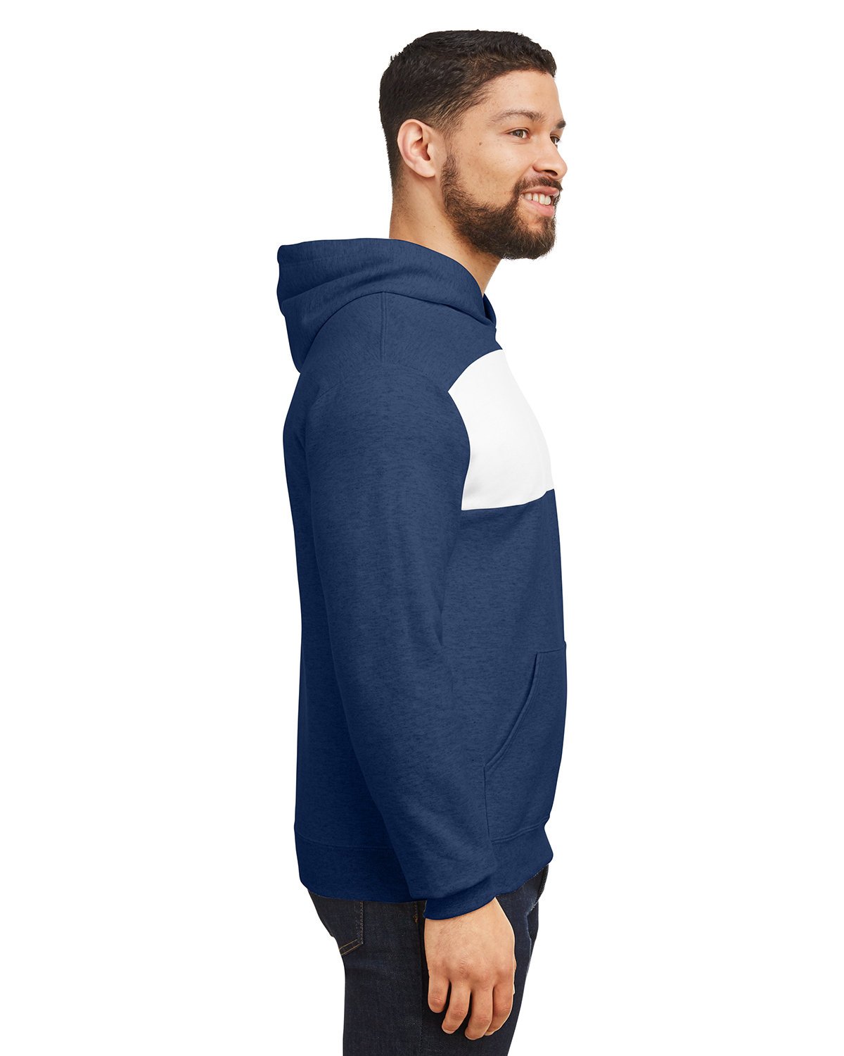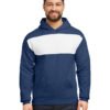 50% cotton, 50% polyester Nublend pre-shrunk fleece; NuBlend pill-resistant fleece; Made with sustainably-sourced, USA-grown cotton; High stitch density for a smooth printing canvas; Contrast self-fabric fleece panel; Contrast shoulder-to-shoulder tape; No drawcord in the hood; 2-ply hood; Front pouch pocket; Two-needle coverstitching on neck, armholes, and waistband; 1×1 rib cuffs and waistband; Quarter-turned to eliminate center crease; Taer away label