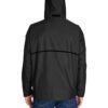 2.8 oz., abrasion-resistant 100% nylon taslan shell with polyurethane coating for enhanced wind- and water-resistance; 2.95 oz., 100% polyester dyed-to-match tricot big hole mesh lining in body; 1.7 oz., 100% polyester taffeta lining in sleeves; roll-away three-piece hood with 1¼” rain bill; Black 3/8″ taping adds contrast to back and sleeves; EZEM zipper in back lining for easy decoration access; center front/lower pockets with molded plastic zipper with garage