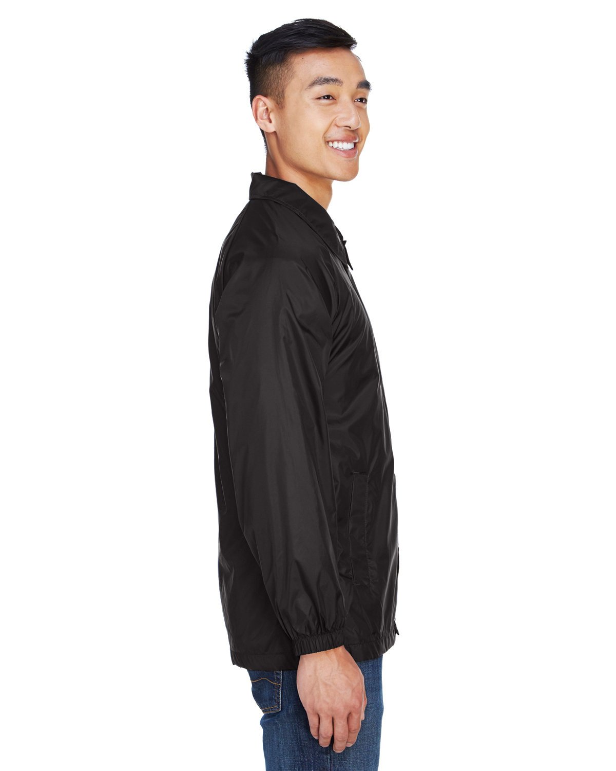 100% nylon taffeta; Water-resistant; Soft Heather Grey jersey lining (Sunray Yellow lined in White); Wind- and water-resistant; Raglan sleeves with full elastic openings; Front welt pockets; Snap center front opening; Open-bottom hem finish; InconspicuZip for easy embroidery access