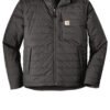 Lightweight yet warm this jacket is amazingly durable and dependably water repellent. 1.75-ounce 100% nylon Cordura shell Rain Defender durable water repellent Wind Fighter technology tames wind Nylon lining quilted to 100-gram polyester insulation Reverse coil center front zipper Zip-through collar Left chest map pocket with reverse coil zipper Two hand pockets with hidden snap closures Two interior pockets: one zippered one hook and loop closure Hook and loop adjustable cuffs Drawcord adjustable drop tail hem Carhartt-strong triple-stitched main seams Carhartt label sewn on chest pocketRelaxed fit