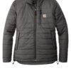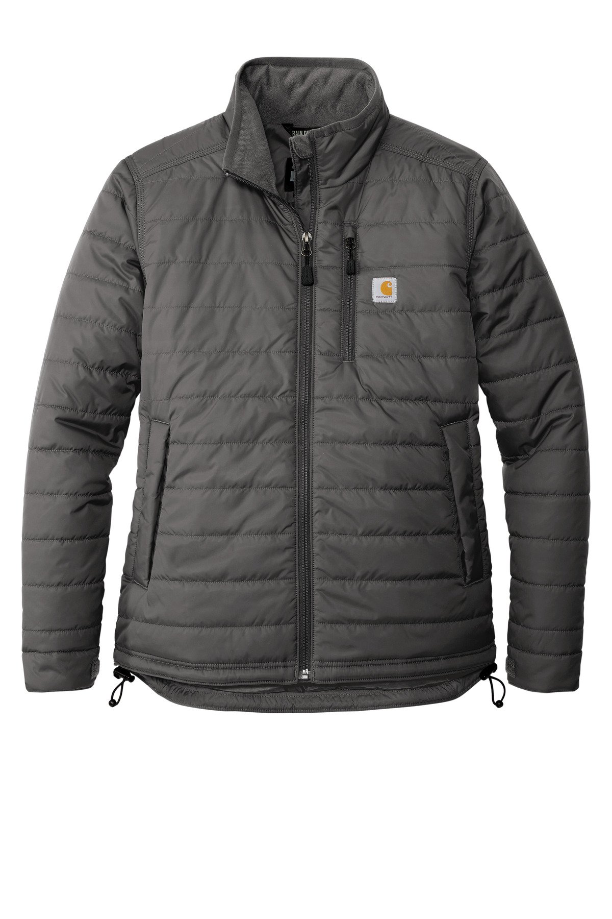 Keep working through cold wet weather in this women’s version of our popular Gilliam Jacket. 1.75-ounce 100% nylon Cordura shellRain Defender durable water repellentWind Fighter technology tames windNylon lining quilted to 100-gram polyester insulationReverse coil center front zipperZip-through collarLeft chest map pocket with reverse coil zipperTwo hand pockets with hidden snap closuresTwo interior pockets: one zippered one hook and loop closureHook and loop adjustable cuffsDrawcord adjustable drop tail hemCarhartt-strong triple-stitched main seamsCarhartt label sewn on chest pocketRelaxed fit